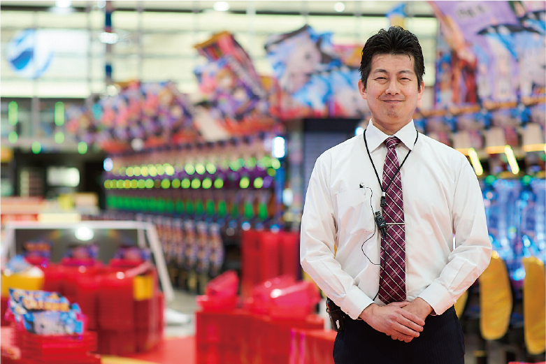 お店に来てくださるお客さまを増やす戦略を考え、ともに働く仲間とアクションをとっていくことが店長の仕事です。お客さまに対する接客のほか、遊技台の売り方、販促展開など、ライバル店と比べて分析しながら、お客さまにとってもっと良いことはないかと、日々試行錯誤を重ねています。仕事の中で感じる自身の成長は、副店長、店長と職位が上がるにつれ、仕事への愚痴や言い訳がなくなり、知恵が湧くようになったこと。上司に恵まれながら経験を積み、自身の言動が持つ影響力が大きくなることで、働く上での責任感はもちろん、「自社の理念の体現者であろう」とする気持ちが強まったと思います。少しのハプニングでは動じない心の強さも得ました。